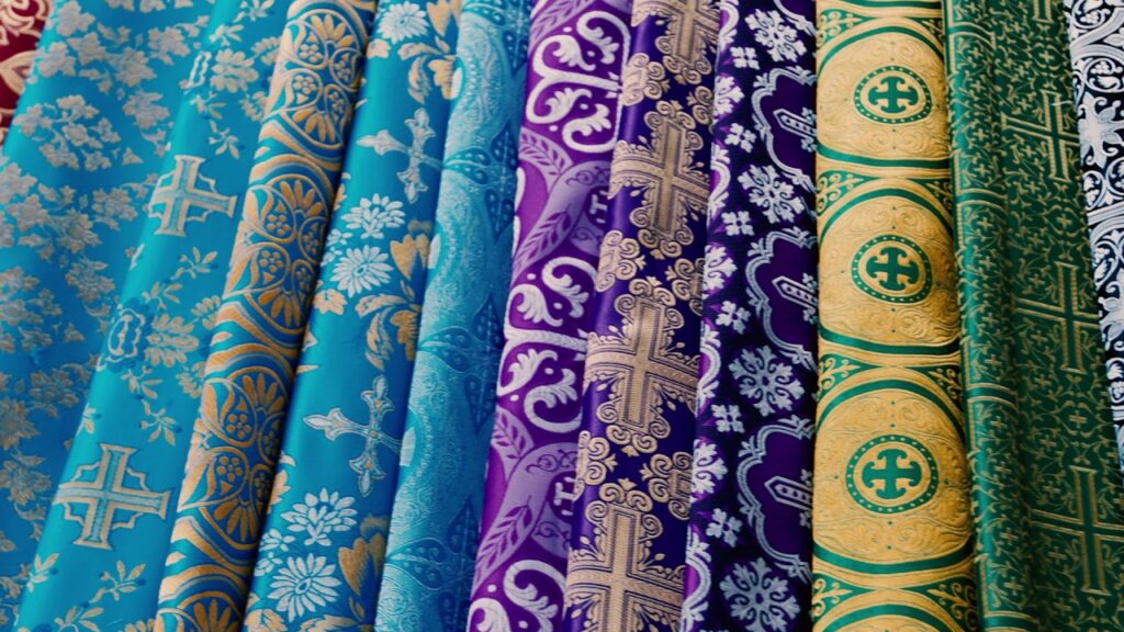 Цветовая гамма должна соответствовать литургическому календарю. Белый и золотой цвета используются для великих праздников, красный — для дней памяти мучеников, фиолетовый — для периодов поста, зеленый — для обычных дней. При выборе Церковные ткани следует убедиться, что оттенок соответствует церковным традициям.